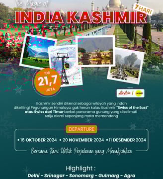 Jelajahi keindahan India dari Delhi ke Agra dan Jaipur, kunjungi Taj Mahal, Amber Fort, serta nikmati pemandangan Gulmarg. Akhiri dengan pengalaman romantis di Taj Mahal saat sunrise.